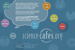 A Science Cafe is an informal meeting between scientists, citizen scientists, and everyday people with a curiosity for science. Discussions are inclusive and focus on plain language. These meetings are happening all around the country and they seem like a great way for science educators to connect with the science community and also with the general public.