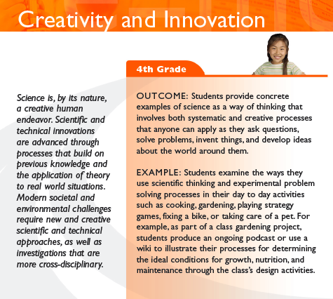 The map is organized into categories such as “Creativity and Innovation” and gives outcomes and examples at grades 4, 8, and 12. See the example below.