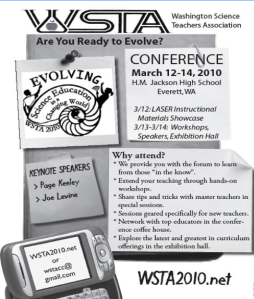 Hi to all elementary teachers of science in Washington State. I will be presenting at the Washington Science Teachers Association Conference- Saturday, March 14 9:25-10:55 am.