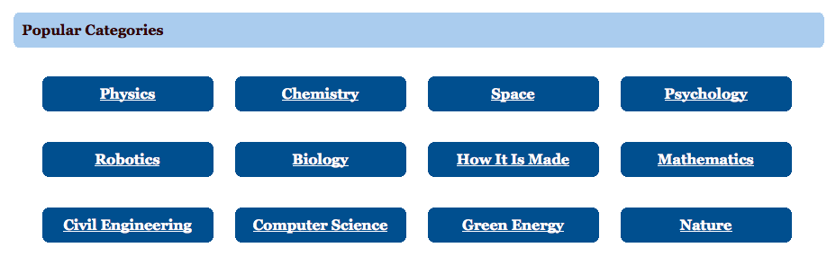 ScienceHack also has videos categorized by science content areas such as physics, space, chemistry, etc.