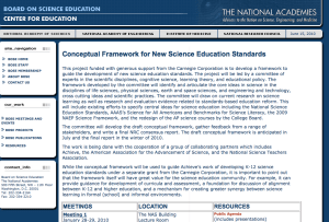 The 4th meeting of the committee tasked with developing a conceptual framework for the new science education standards took place last week. If you are interested in seeing the agendas, presentation materials, and resources from the previous meetings, then check out the Standards Framework Homepage.