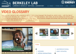 The Lawrence Berkeley National Lab has a Video Glossary featuring 1-2 minute video clips where scientists and engineers explain a variety of scientific terms and concepts. You will find more than 50 terms with more being added frequently. See the Gravity video embedded below.
