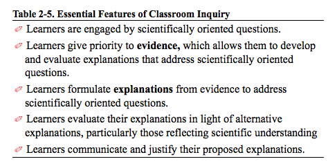 Notice that questioning is obviously important (the word questions is mentioned in statements 1-3) but also notice that evidence and explanations are central to statements 2-5. Inquiry is about answering scientific questions using evidence-based explanations.