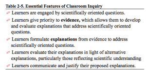 Now this is not a new framework- The National Science Education Standards (1996) challenge us to consider three perspectives of inquiry: the teaching strategies that support student inquiry, the abilities of inquiry, and the understandings of inquiry. This is essentially what I’m promoting in these posts.