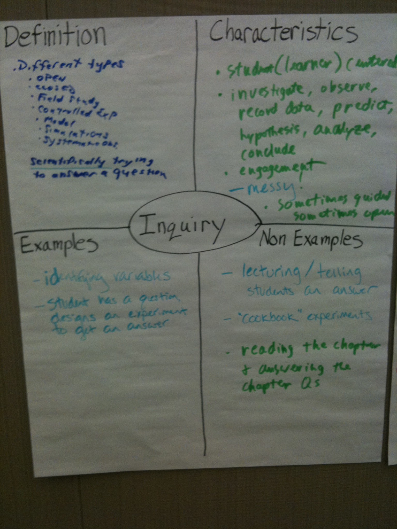 I conduct a lot of professional development on inquiry with adult learners and I typically start with uncovering the participants’ initial ideas about inquiry. I will sometimes use a Frayer Model (see example left) or have folks list the characteristics of inquiry. Regardless of the strategy I use, the results are typically the same. Inquiry is defined by terms such as: hands-on, questioning, open-ended, student-centered, messy, noisy, and authentic. Now don’t get me wrong- I’m not saying these are incorrect- I’m just saying that for many of us, our initial ideas about inquiry are incomplete.