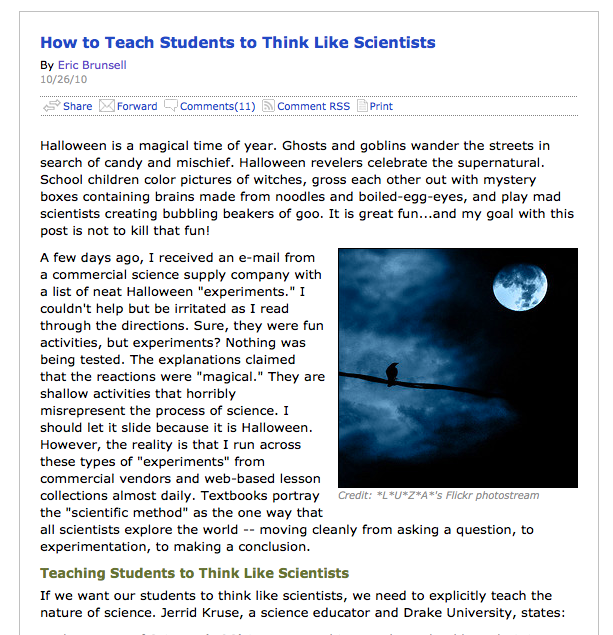 Today Eric Brunsell posted a concise and well-written piece titled How to Teach Students to Think Like Scientists. The post discusses the nature of science (NOS), common NOS misconceptions and ways to teach students about the nature of science. You will also find links to online resources to extend your own learning about the nature of science.
