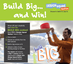 Design Squad Nation is sponsoring a design challenge- The Big Build Contest– where students build a BIG version of a Design Squad Nation activity and upload a video of their creation. This seems like a perfect opportunity to integrate some project-based STEM learning in a classroom.