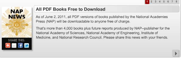 As of June 2, 2011 The National Academies Press (NAP) has made all of their publications (over 4,000!) available FREE as downloadable pdfs. In terms of science education this means that you can now get (and share) some excellent research and reports on effective science education. Read the NAP press describing release HERE.