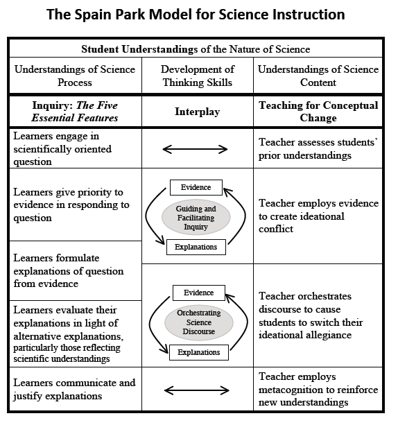 The Spain Park Model is an elegantly simple and brilliant way to connect the 5 Essential Features of Classroom Inquiry to the stages of Conceptual Change. Download the Spain Park Model and examine your science instruction practices. Are you intentionally providing students with opportunities to practice the features of classroom inquiry? Are you helping students uncover their initial ideas about key concepts? Are you also facilitating students to modify their changing ideas based on evidence?
