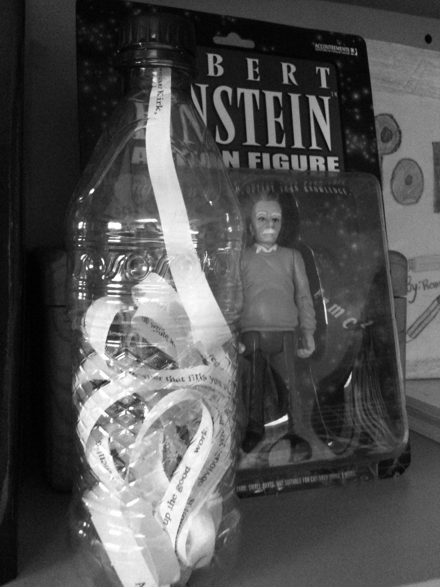 On the last day of class, as I went to turn in grades and clean out my mailbox, I discovered an empty Dasani water bottle tucked beneath some junk mail. Inside the bottle was one long strip of paper wound in an artistic tangle. I gently pulled out the strip of paper, like the NY Stock exchange ticker, and read the following from one of my college students: