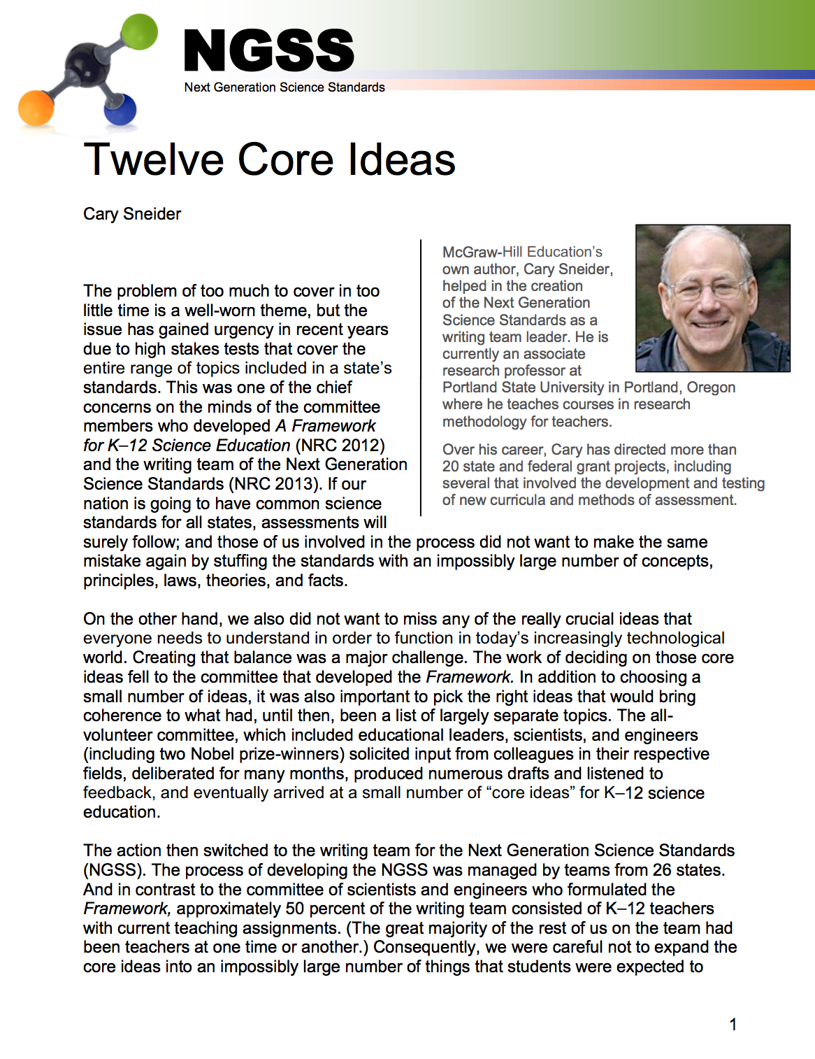 McGraw-Hill has published a white paper by Cary Sneider describing the story behind the 12 core ideas in the Next Generation Science Standards. The paper also makes the case for why a limited number of core ideas is important in science education.