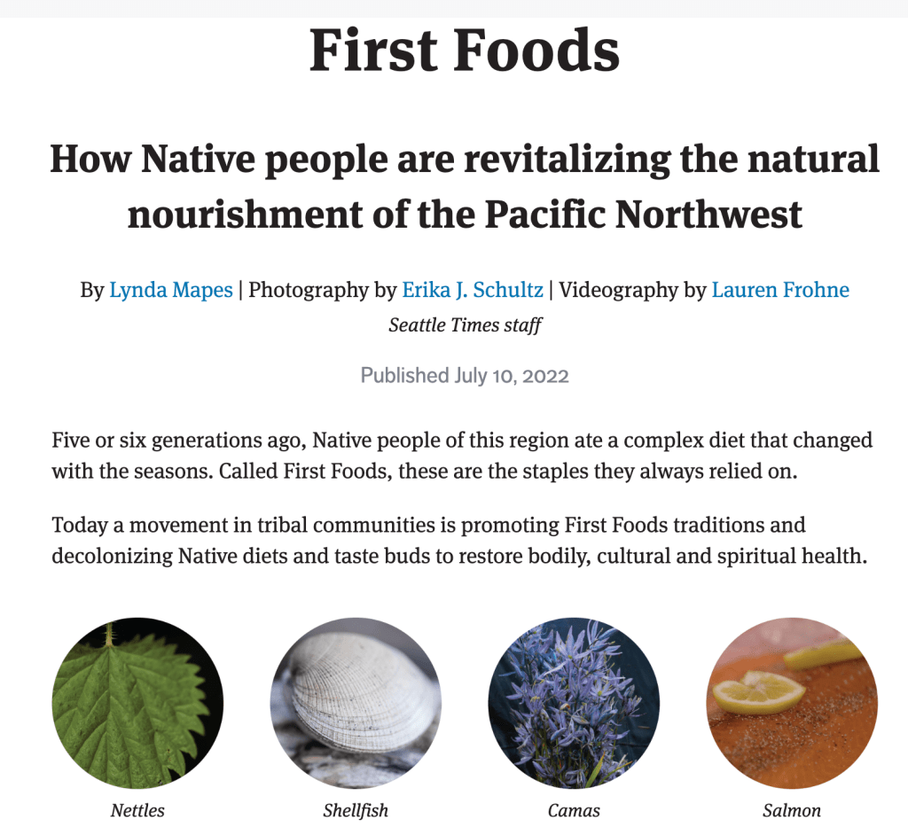 I recently took an online course that featured this thoughtfully designed interactive article by the Seattle Times on First Foods. The article clearly describes Indigenous “First Foods,” which refers to the traditional and culturally significant foods of Native peoples in the Pacific Northwest region of the United States. The website showcases the efforts of Native communities to preserve and revitalize their food traditions, which are deeply intertwined with their cultural heritage and way of life.