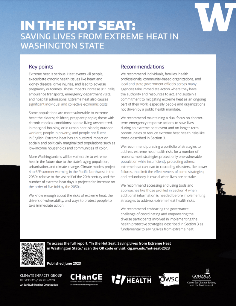 The University of Washington (in partnership with other groups) recently released a report on the perils of extreme heat in the Pacific oNrthwest. In the Hot Seat: Saving Lives from Extreme Heat in Washington State comprehensively describes the challenges posed by extreme heat while providing concrete and actionable guidance for both immediate emergency response and long-term risk mitigation. The publication tackles several crucial questions, including: