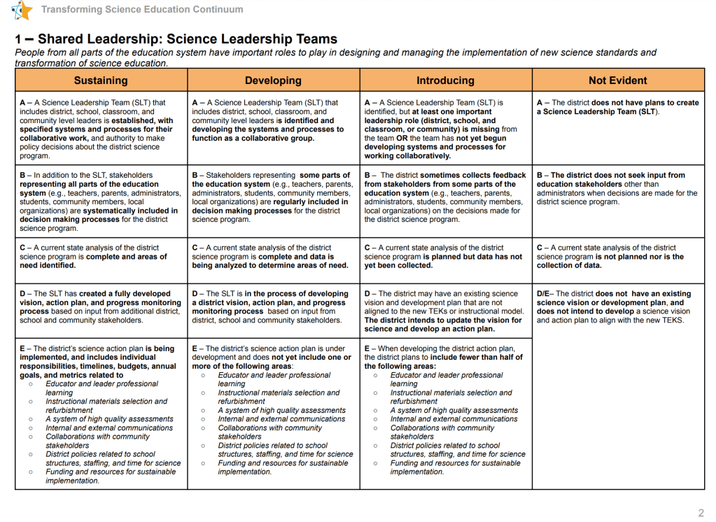 The Texas Collaborative for Science Innovation comprises a coalition of 13 school districts in Texas, working together to enhance science education within their communities. Through collaborative efforts, they aim to elevate the quality of science teaching and learning. By collectively envisioning an improved science education landscape in line with the state’s new science standards, these districts have adopted a tool known as the Transforming Science Education Continuum. While your state might be using the NGSS or other Framework-aligned science standards- this tool still provides a powerful way to represent and monitor implementation work. This tool empowers educational leaders to deliberate on both long-term and short-term objectives across essential aspects such as professional learning. By evaluating the current state of their science programs, they can strategically plan and implement necessary actions to bring their envisioned future of science education to fruition.